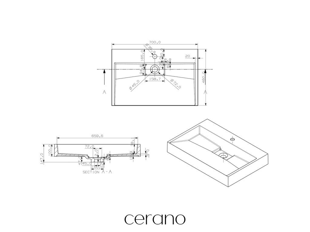 CERANO - Umývadlo z liateho mramoru Vita - nástenné aj na dosku - otvor pre batériu - biela lesklá - 70x46 cm