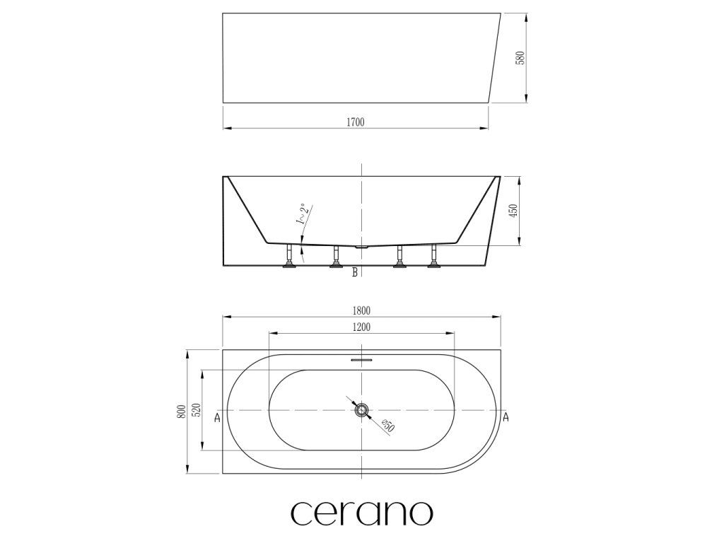 CERANO - Voľne stojaca akrylátová vaňa Bianco, ľavá - biela lesklá - 180x80 cm