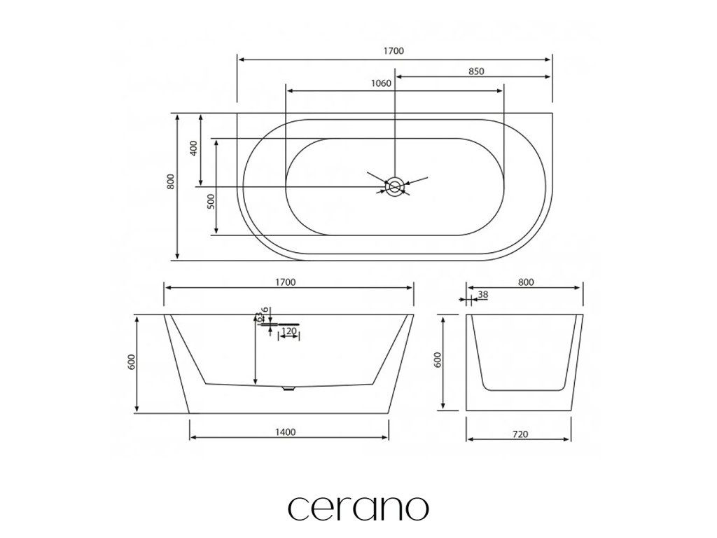 CERANO - Voľne stojaca akrylátová vaňa Grazia, nástenná - biela matná - 170x80 cm