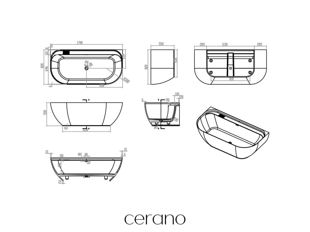 CERANO - Voľne stojaca vaňa z liateho mramoru Valeria, nástenná - biela matná - 170x82 cm
