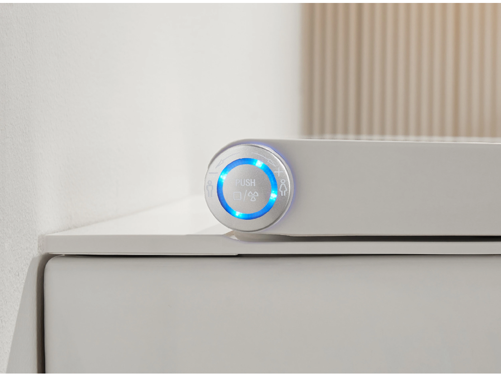 Kruhový ovládač umiestnené na boku toalety umožňuje jednoduché a intuitívne nastavenie funkcií . Pomocou otočenia kolieska môžete regulovať teplotu vody, prietok aj polohu umývacej trysky , a tým si prispôsobiť umývanie presne podľa svojich potrieb . Koliesko slúži aj na prepínanie nočného LED osvetlenia medzi režimami, čo uľahčuje ovládanie bez potreby diaľkového ovládača.