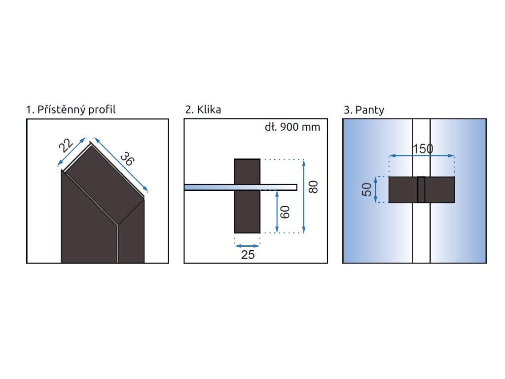 Sada obsahuje všetko potrebné na montáž dverí: tesnenie, kľučku, pánty. Na oboch stranách dverí je možné použiť rozširujúci profil, ktorý umožňuje zväčšiť rozmer dverí vždy o 25 mm.