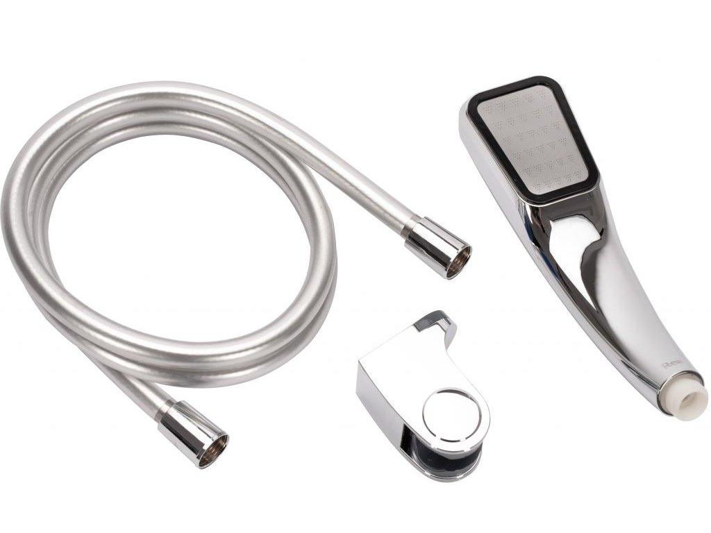 Sprchový set pre kúpeľňovú batériu. Vďaka tejto úspornej sade môžete znížiť spotrebu vody až o 50 %. Sprchová hlavica je vyrobená z pevného plastu pokrytého odolným lakom, hadica je vyrobená z gumy s nerezovým opletom. Vďaka špeciálnemu poťahu sú časti setu odolné a ľahko sa čistia.